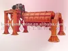 This machine uses the Roller to support the pipe mould, and produce the roller force to concrete in the mould. When the roller rotate at a high speed, the concrete in the mould will spread in the inner wall of the pipe mould and form a cement pipe with the centrifugal force, and when the mould with the inner concrete pass on the roller, the concrete between the mould and the roller will be compacted solid to form a pipe.